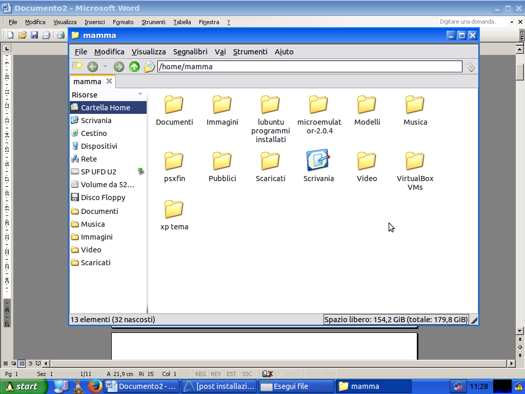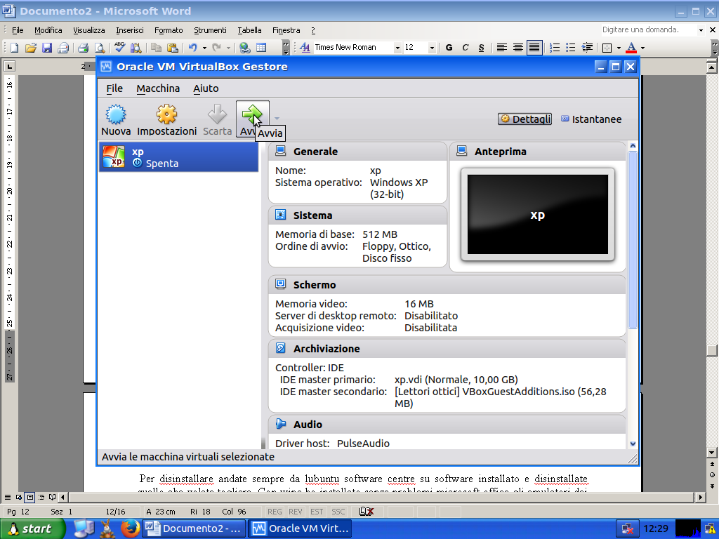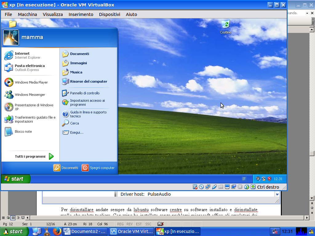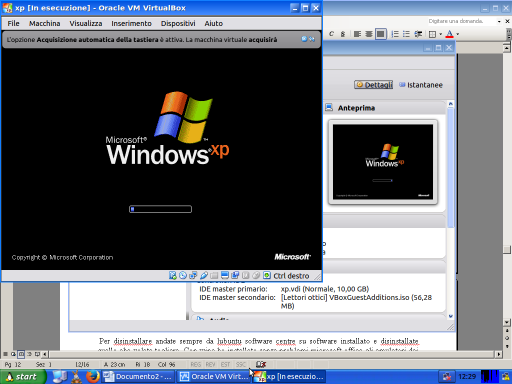 Cercate Wine dal lubuntu software center selezionatelo poi aggiungi al carrello. Poi dal carrello installa. Wine vi serve per installare i programmi che girano in ambiente operativo windows vale a dire i file .exe. Una volta installato per installare i file .exe vi basterà cliccare due volte il file da installare esattamente come su windows. (se non ricordo male solo la prima volta quindi solo al primo file .exe bisogna dargli i permessi di esecuzione e cioè tasto destro sul file .exe poi proprietà permessi e mettete chiunque in esecuzione). Nel caso alcuni file exe (programmi e giochi che girano in ambiente microsoft) non vengono installati correttamente tramite wine, allora avete altre 2 soluzioni: 1 Playonlinux. Tale programma configurerà wine scaricando altri file da internet necessari alla corretta installazione del file .exe che non si riusciva a installare tramite il solo wine. 2 Virtualbox vi serve per emulare in toto windows come sistema operativo (da windows 95 a windows 10). E’ come avere un altro computer nel computer. Perciò dovete installare all’interno della virtualbox il sistema operativo che volete allo stesso modo di come se lo installaste su un altro pc. Perciò o vi procurate un cd con il sistema operativo sopra o il file iso del sistema operativo. Nel caso del file .iso date il percorso del file iso al posto del lettore cd. Ricapitolando con wine potete installare tutti i file .exe di microsoft. Se qualche programma con wine non va allora tramite playonlinux o ancora meglio vitualbox potete installare tutti i programmi che volete anche con crack (che non è legale) e quanto altro. Queste sono alcune schermate di virtualbox mentre carica xp. ,