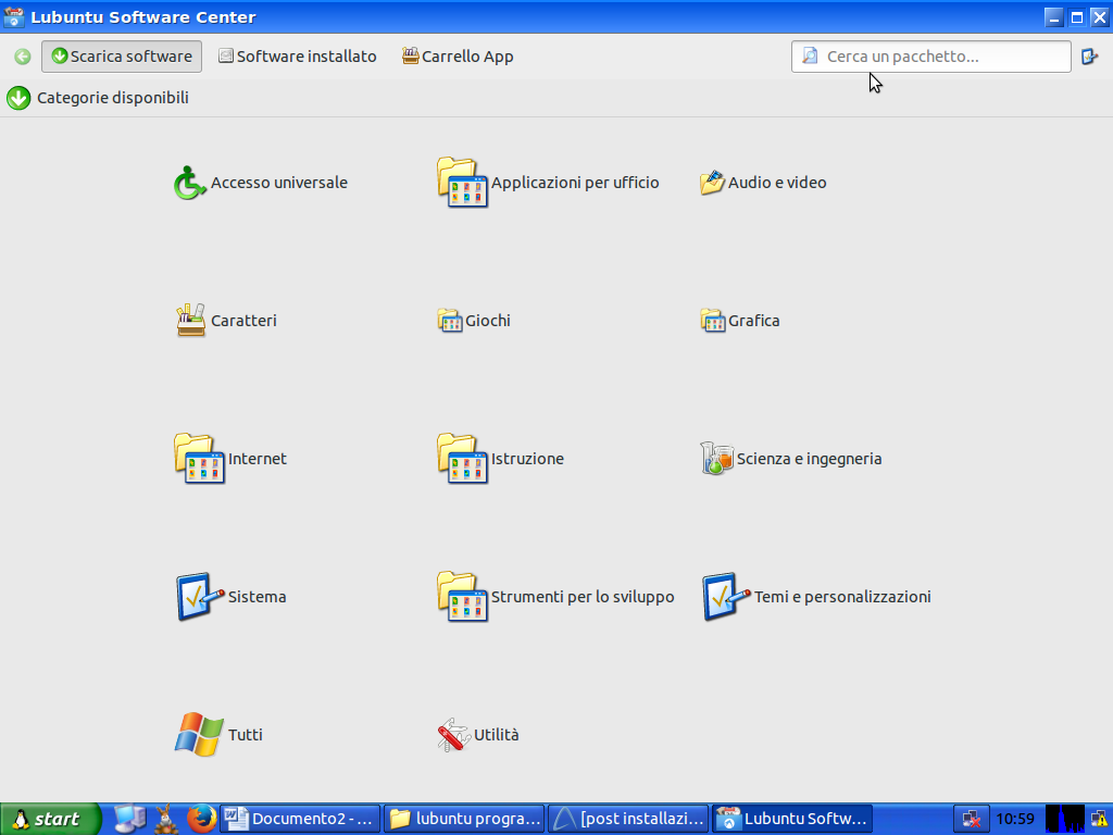 Andate su start / strumenti di sistema / lubuntu software center. Il lubuntu software center corrisponde al play store di android e all app store di mac. Anche da qui è possibile scaricare e installare migliaia di programmi. Non dovete fare altro che cercare il nome del programma aggiungerlo al carrello e poi dal carrello installarlo. Per twitter ad es potete scaricare Hotot. Di default lubuntu ha Sylpheed per le mail. Se volete uno più completo allora scaricate Thunderbird come client mail. Per la musica lubuntu ha preinstallato Audacious che è ottimo. Per quanto riguardo i video abbiamo preinstallato l'ottimo Gnome Mplayer quindi non dobbiamo installare null'altro. Comunque se volete Vlc lo scaricate allo stesso modo.