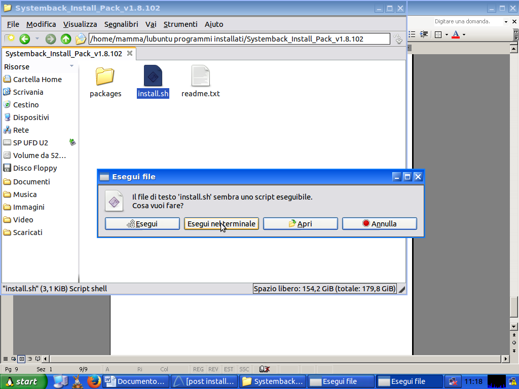 Nel terminale copiate e incollate tale comando (che vale per tutti i file .sh) sudo ./nomefile.sh (N.b. tra sudo e il punto ce uno spazio) dove nome file nel caso di systemback è install perciò copiate e incollate in questo caso sudo ./install.sh. E il programma si installerà. Dovete essere connessi a internet perchè il file dovrà scaricare altri file necessari all'installazione e al funzionamento del programma. Se qualcosa va storto andate in software e aggiornamenti e in software per ubuntu cambiare server. Chiudere software e aggiornamenti aspettare che il database si aggiorni si tutti i pacchetti disponibili per ubuntu e riprovare a installare systemback. Tale procedura di cambiare server in software e aggiornamenti va effettuata anche nel caso abbiate problemi a installare programmi da gestore pacchetti e dal lubuntu software center.